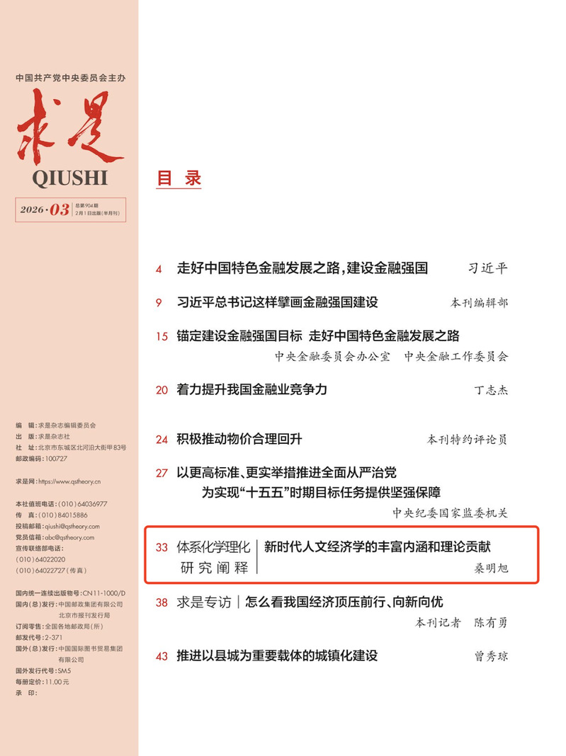 2月1日出版的《求是》杂志(2026年第3期),刊发了我校人文经济学研究院执行院长、政治与公共管理学院桑明旭教授的理论文章《新时代人文经济学的丰富内涵和理论贡献》。