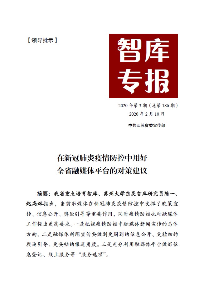 此外,在舆情应对方面,传媒学院陈一副教授研究了近期江苏“省市县”三级媒体融媒体平台的表现,撰写《在新冠肺炎疫情防控中用好全省融媒体平台的对策建议》并刊载于省委宣传部《智库专报》,提出进一步用好、用足全省的融媒体平台做好疫情防控工作的建议。王健法学院陈仪副教授为苏州市政府提供了“传播虚假有害信息的法律治理”相关材料,为疫情期间谣言治理提供法律咨询。