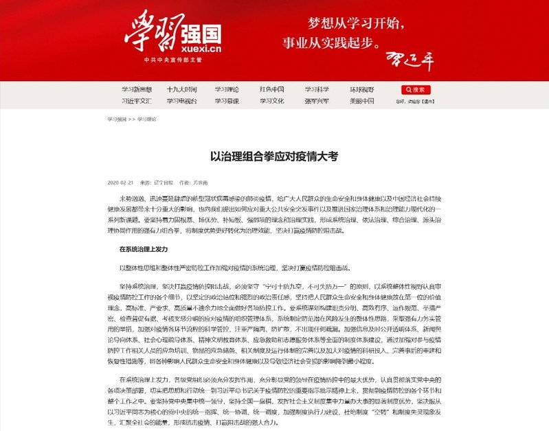 疫情发生以来,东吴智库积极组织专家学者开展建言建策,关注疫情防控和经济社会发展工作,为进一步推进国家治理体系和治理能力现代化提供思路与方法。东吴智库首席专家、马克思主义学院方世南教授在《辽宁日报》发表文章《以治理组合拳应对疫情大考》,文中指出“疫情期间要坚持着力固根基、扬优势、补短板、强弱项的理念和治理实践,形成系统治理、依法治理、综合治理、源头治理协同作用的强有力组合拳,将制度优势更好转化为治理效能,坚决打赢疫情防控阻击战。”文章被光明网理论频道和“学习强国”平台转载。