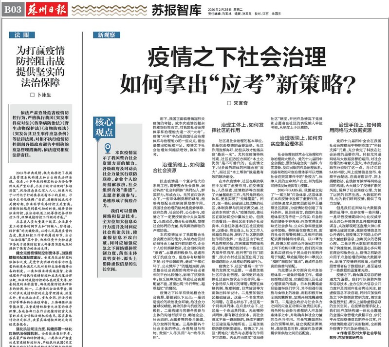 政治与公共管理学院副院长黄建洪教授接受人民日报社《国家治理》周刊访谈。他认为,新冠疫情这场大考,是极限战、超限战、立体战,从根本上说是党领导下的人民战。本次疫情应对充分体现了三方面制度优势,即党的集中统一领导、独特的党政结构和人民团结有力量。社会学院宋言奇教授针对疫情之下社会治理如何提质增效,从治理策略、治理主体、治理板块和治理手段四个方面提出具体策略,所撰文章《疫情之下社会治理:如何拿出“应考”新策略》刊载于《苏州日报》“苏报智库”专刊。