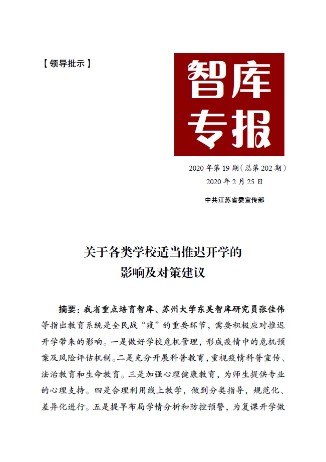 东吴智库发挥综合性学科优势,基于长期理论研究与实践成果,为疫情防控工作提供多维度支持与帮助。社会学院毕建新副教授基于国家自然科学基金项目研究基础,撰写了《无纸化背景下国家自然科学基金项目档案管理机制研究报告》,为疫情期间避免大规模人群聚集发挥了作用。政治与公共管理学院尤小立副教授应邀为中国科学院、工程院所办《中国科学报》撰写专栏文章《从“抢发论文”现象反思科研目标和管理》。王健法学院副院长程雪阳教授撰写《关于防治新型冠状病毒过程中政府临时征用权行使规范的建议》,通过中国宪法学研究会提交给中央政法委作为决策参考。冯嘉副教授撰写《关于禁食野生动物的立法和执法建议》等并报送《人民日报》内参。师范学院副院长张佳伟副教授撰写《关于各类学校适当推迟开学的影响及对策建议》刊载于省委宣传部《智库专报》。