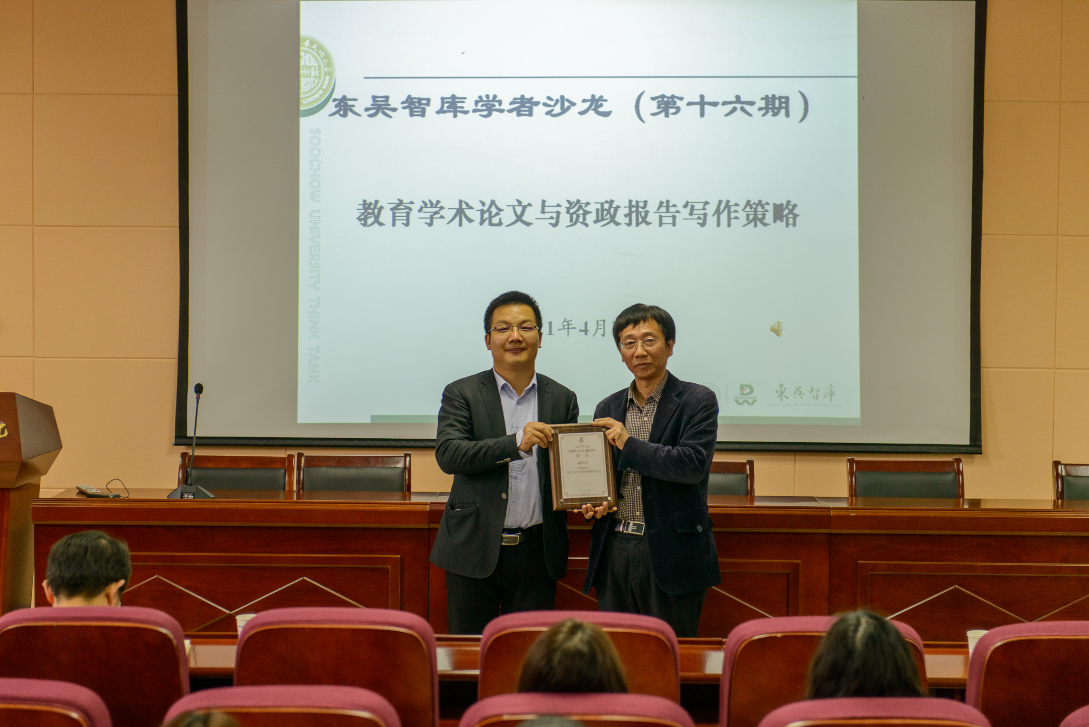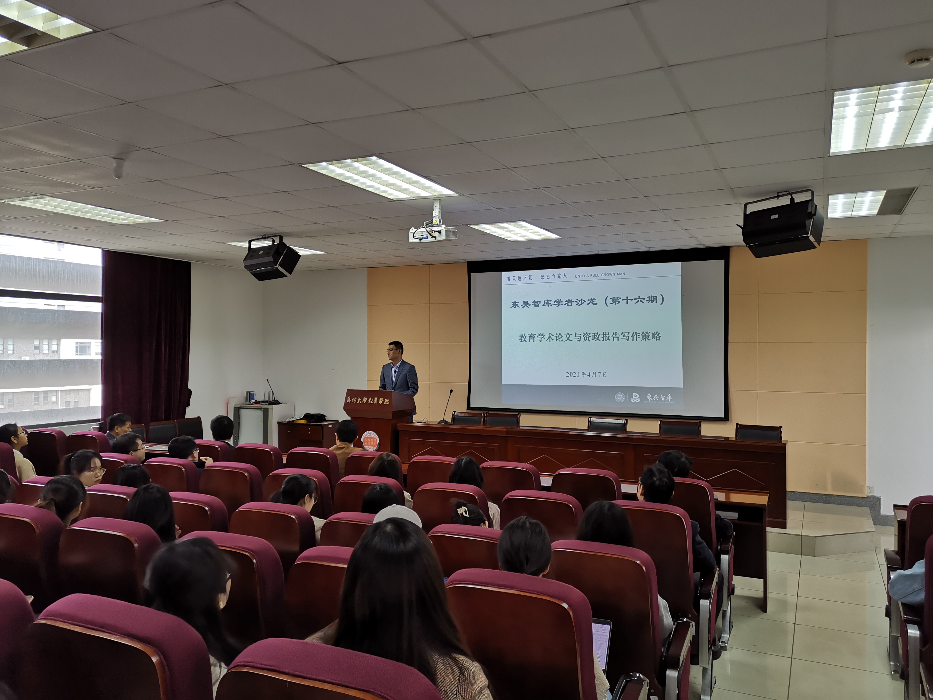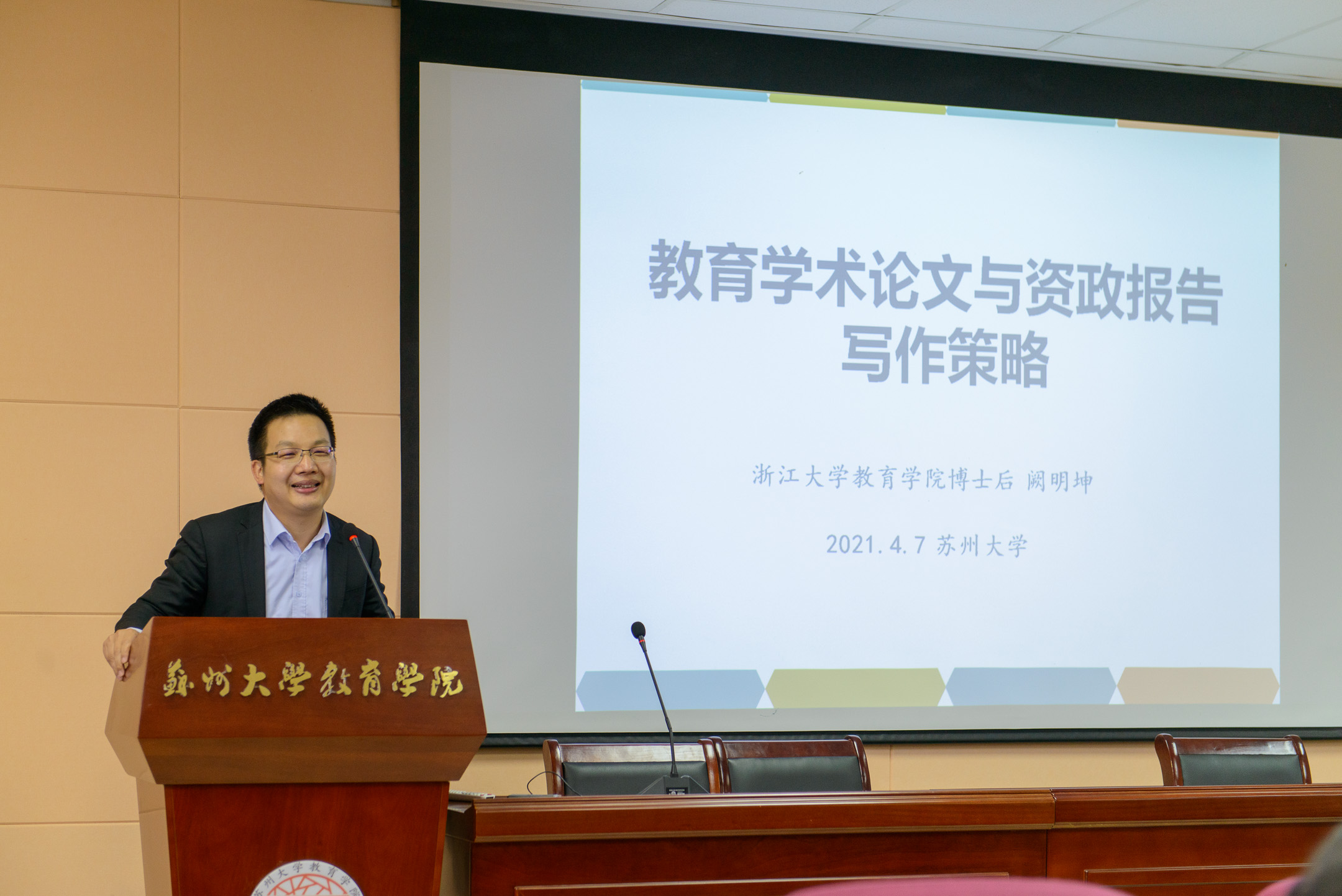 4月7日下午,第十六期东吴智库学者沙龙在苏州大学独墅湖校区1005-5536会议室举行。本期学者沙龙围绕“教育学术论文与资政报告写作策略”主题,邀请了江苏省“紫金文化人才培养工程”社科优青、无锡太湖学院校长助理阙明坤进行经验分享与交流。教育学院院长冯成志、东吴智库执行院长段进军、人文社科处和教育学院师生代表参加了本次活动。沙龙由东吴智库研究员、教育学院教授王一涛主持。