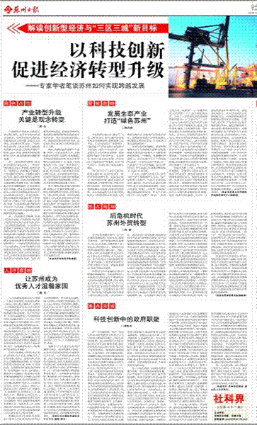 全市转型升级大会,提出了“三区三城”新目标,其中,最佳宜居城市和文化旅游城市,都和发展生态产业,打造“绿色苏州”紧密相关。“绿色城市”的涵义绝不仅局限于空间绿化,更在于生态优美、人居适宜以及人与自然充分和谐。更深刻的内涵在于生态产业。生态农业、生态工业以及生态第三产业构成了“绿色苏州”的骨架,打造“绿色苏州”,发展生态产业是关键与基础。