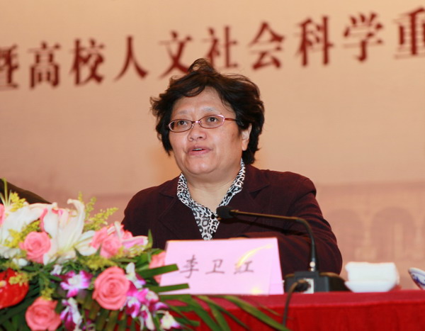 李卫红传达了中央和教育部党组这一时期对繁荣发展高校哲学社会科学的重要精神和工作部署,对学习贯彻十七届六中全会精神、李长春同志批示、刘延东同志讲话提出了明确的要求,她还围绕这次论坛的主题,就改进高校科研评价机构提出了具体的要求:要深刻认识科研评价改革对繁荣发展高校哲学社会科学的重要性和紧迫性;抓重点、突难点,深入推进科研评价改革;加强领导,统筹推进,将改进科研评价工作落到实处。希望各教育行政部门和各高校,认真学习领会,以更加开阔的思路、更加有力的举措结合本地本单位实际,把中央和教育部党组的精神和要求落到实处,为在新的起点上开拓高校哲学社会科学繁荣发展的新局面而努力奋斗。