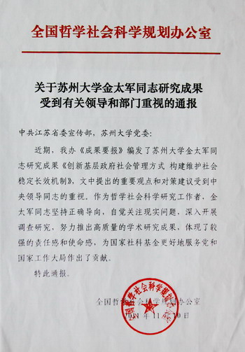 近期,全国哲学社会科学规划办公室发出通报,称“近期,我办《成果要报》编发了苏州大学金太军同志研究成果《创新基层政府社会管理方式 构建维护社会稳定长效机制》,文中提出的重要观点和对策建议受到中央领导同志的重视。”