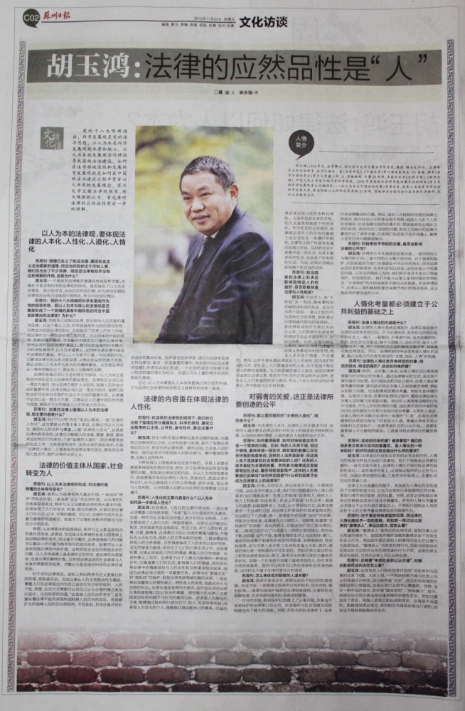 胡玉鸿:我们可以用“四化”来加以概括:一是“法律的人本化”,这主要是从价值主体上来说,法律应当以人为本位,体现对人的关怀与尊重;二是“法律的人性化”,这是就法律内容而言的,法律应当根据人的本能、需要、愿望、期待来设定相关行为准则;三是“法律的人道化”,即法律要考虑到社会上有一大批弱者的存在,实现法律的倾斜保护;四是“法律的人情化”,主要是指在法律实施的场合,要体现法律的人性关怀,维护法律的实质正义。