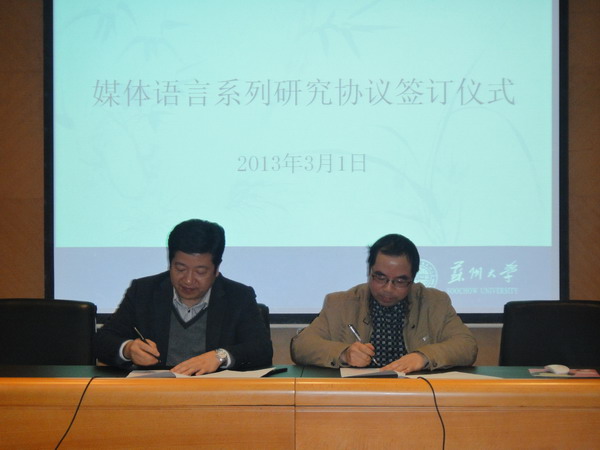 随后,海门市委宣传部副部长何伟华和苏州大学汉语及汉语应用研究中心主任曹炜分别代表双方在协议书上签字。按照协议,海门市委宣传部将资助几十万元的经费用于相关学术研究及学术著作出版。