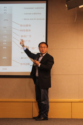 在分析了当前中国媒介产业的现状后,胡正荣指出,虽然媒介产业总收入呈增长趋势,但报纸、杂志、广告和音频、视频产品的发展却不容乐观。通过一系列丰富而翔实的数据和图表的对比及分析,胡正荣告诉大家:“现今媒体生态迅猛变化,大家要改变原先的单媒体思维,学会全媒体的意识架构,再学习专业知识,否则当你们毕业时就out了!”