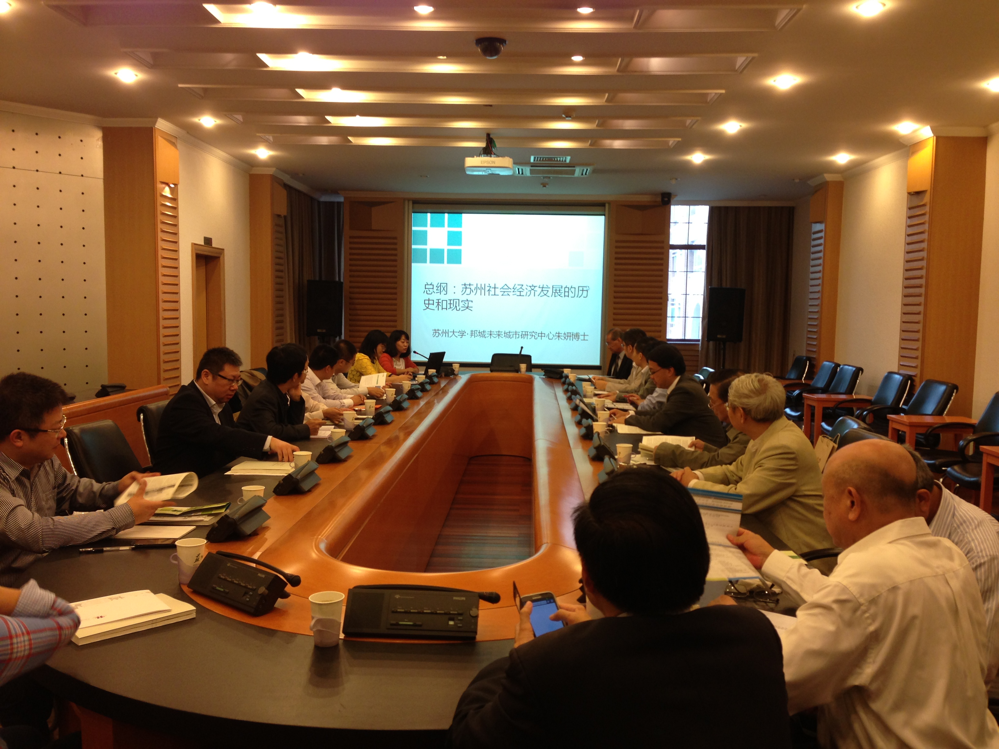 研究中心的朱妍博士、韩坚副教授、吴莉娅副教授、宋言奇教授和张晨副教授分别就“苏州发展的历史和现实”、“苏州经济转型”、“苏州城市转型”、“苏州社会转型”和“城市公共管理转型”等子课题作了汇报;刘晓平教授、雷诚教授、肖为周副教授、汪德根教授和戴叶子老师分别就“后土地经济驱动时代的规划转型”、“苏州城市空间演进”、“苏州交通转型”、“创意城市设计理念对旅游业发展影响”和“苏州古城空间转型”等子课题进行了汇报。