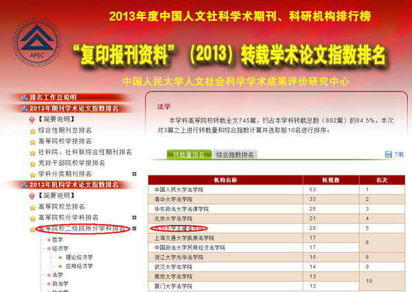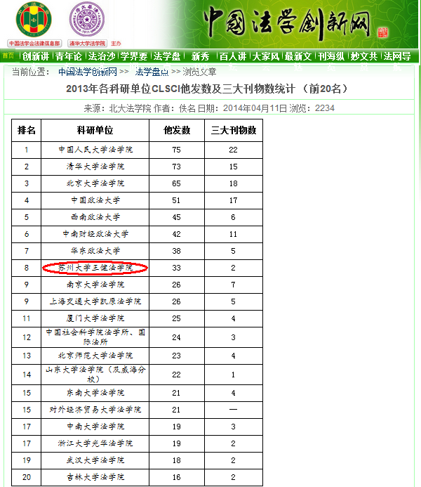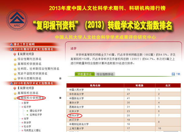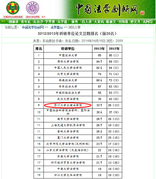 日前,中国法学会主办的“中国法学创新网”对2013年刊发于法学界公认的15种权威刊物(简称“CLSCI”)各科研单位发文数进行了统计,我校王健法学院以论文数33篇,位列全国各法学科研单位总发数第9、他发数第8,双双进入前十行列,成绩喜人。与2012年度的总发数第13、他发数第9的成绩相比,有了明显进步。 本次CLSCI论文总发数是王健法学院首次进入全国前十,体现了学院科研实力的明显提升。就他发数而言,本次排名仅次于中国人民大学法学院、清华大学法学院、北京大学法学院、中国政法大学、西南政法大学、中南财经政法大学、华东政法大学。 以二级学科而论,学院相关学科排名也有了明显提升,榜上有名的学科分别为:行政法学(全国第3名)、刑法(全国第5名)、国际私法(全国第8名)、民法学(全国第9名)、法律史(全国第9名)、刑事诉讼法学(全国第11名)、经济法(全国第12名)、法理学(全国第14名)、民事诉讼法学(全国第18名)。作为苏州大学的传统优势学科,行政法学继续保持了其领先地位,而刑法学、民法学、法律史等学科的迅速崛起,不仅平衡了学科之间的发展,更在全国法律院校中引起了高度关注。 与此同时,学院2013年度二次文献转载情况也有明显提升。据中国人民大学复印报刊中心2014年3月发布的报告,王健法学院在2013年度有20篇论文被人大复印资料全文转载,在“2013年机构学术论文指数排名”中,“高等院校分学科排名”上位列第7,“高等院校二级院所分学科排名”中位列第5,取得了历史上的最好成绩。 近年来,王健法学院在上级有关部门的关心和苏州大学校方的大力支持下,实施人才强院战略,注重学术研究,提升科研实力,在论文专著、科研项目及科研奖励等硬性指标上都有了明显进步。相信以本次喜人成绩为契机,王健法学院的发展会有一个可以预见的美好未来,从而以优异成绩为“苏大法学百年”献礼!