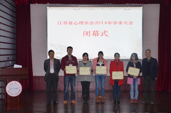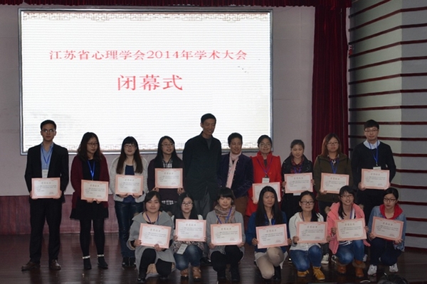 傅宏代表江苏省心理学会对与会领导、承办方以及参会代表表示感谢。他强调,江苏省心理学会坚持“学术交流,科学普及”的宗旨,立足于学会的长足发展,针对大会主题“心理学与城镇化”,集聚智慧,共同探讨,为建设幸福江苏贡献心理学人的一份力量。 韩布新代表中国心理学会对江苏省心理学会学术大会的召开表示祝贺。他指出,江苏省心理学会搭建了独具特色的服务和社会交流平台,为建设和谐江苏作出了重要贡献。 李政对本次大会的召开给予了高度肯定,并对所有参会代表表达了诚挚谢意。 为期两天的学术大会共开展一场特邀主题报告、四场大会主题报告、两场专题重点报告、五场青年心理学家报告,以及八场研究生分论坛报告,共计180余人参会。专家们用高水平、高质量的报告分享了最新的研究进展与成果,反响空前热烈。 11月23日,大会闭幕式上,会议主办方颁发多项学术奖项和服务奖项,包括“第四届青年心理学家学术论坛”、“2014年学术大会优秀论文”、“研究生分会科普宣传先进个人”和“2014学术大会优秀志愿者”。