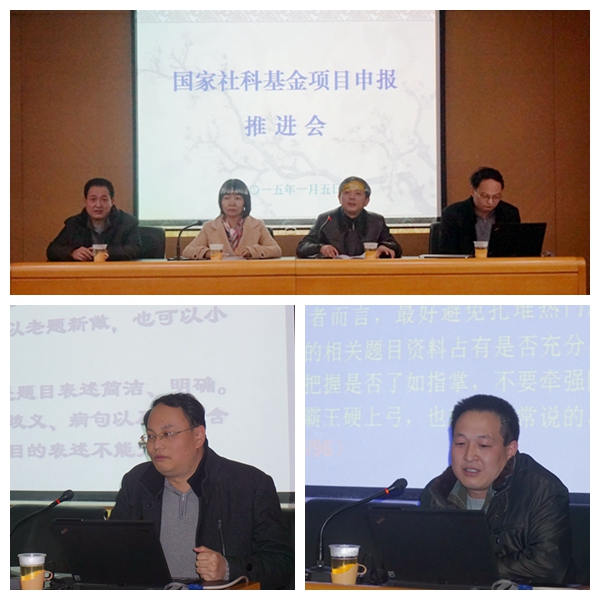 为进一步提高我校国家社科基金项目的申报质量,提高立项层次和数量,1月5日下午,我校在红楼115室召开了2015年国家社科基金项目申报推进会,相关文科学院教师70余人出席了会议。会议邀请了文学院朱建刚、体育学院李龙两位青年教师为与会教师作关于国家社科基金项目申报的辅导报告。会议由人文社会科学院常务副院长母小勇教授主持。