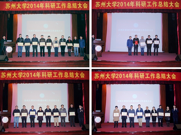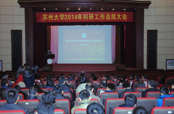 路建美作苏州大学2014年度科技产业工作总结汇报。她总结了2014年度科技产业工作取得的“两大突破、三大提升”:首次以苏州大学为第一完成单位获国家科技发明奖二等奖1项,实现我校零的突破;科研到账经费总额首次突破四个亿,达4.28亿元。获批国家自然科学基金项目324项,全国排名由第18位提升至第16位;“表现不俗的论文占比”以46.36%名列全国第一,三大检索论文2891篇,其中SCIE收录1801篇,SCIE收录全国排名由第25位提升至第22位;专利授权提升至635项,首次获“江苏省十大杰出发明人”称号。在对2014年度科技产业工作获奖单位进行表彰后,路建美分析了2007年以来我校科技工作的发展态势,她指出,当前我校科技工作正处于从“量变”到“质变”的跃升期,面临着两大矛盾,要按照“卓越行动、原创引领、升级发展、集成创新”的发展思路来提升我校科技工作。路建美要求,2015年我校要谋划科技创新、机制创新与管理创新并举;实现学科导向逐步向需求导向转变,组织管理逐步向流动、开放、协同的机制转变,创新要素与资源逐步向汇聚、融合、集成的方向转变;提升科技创新能力、支撑教学质量提高的能力及服务经济社会发展能力;实施分类评价和开放评价,加强项目过程管理,改革科研成果处置权收益权,抓好“十三五”规划和重大项目的前期组织工作,积极推进高水平实质性的国际科技合作,弘扬科学精神、建立学术督导制度。