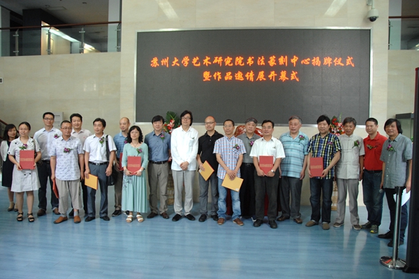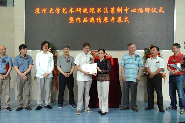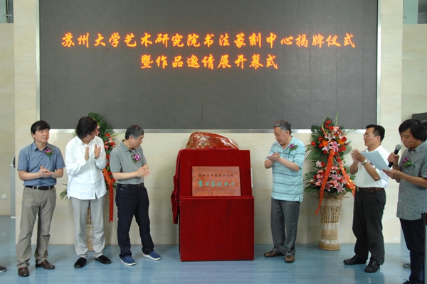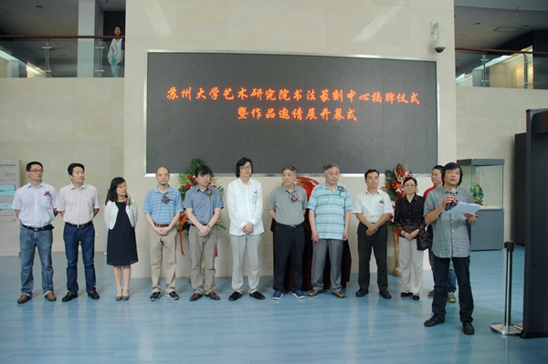 苏州大学艺术研究院书法篆刻中心揭牌仪式暨作品邀请展开幕式于6月24日上午在校本部博物馆举行。中国书协学术委员会副主任、南京艺术学院博士生导师黄惇,苏州大学博士生导师、苏州市书法家协会主席华人德,中国书协学术委员、江苏省书协副主席王伟林,新华报业传媒集团苏州办事处主任高坡,苏州大学党委宣传部常务副部长孙宁华,苏州大学博物馆常务副馆长黄维绢以及艺术学院相关领导和校内外书法界专家、学者一百余人参加了活动。开幕式由苏州大学艺术学院副院长钱孟尧主持。