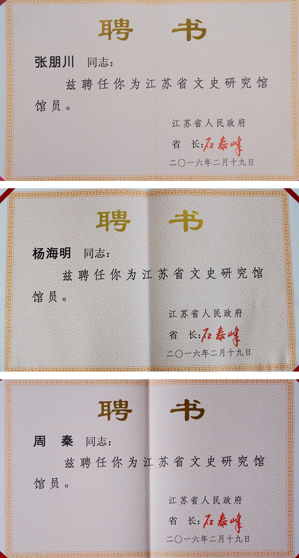 2月22日,江苏省政府参事、省文史研究馆馆员聘任仪式在南京举行,石泰峰省长出席聘任仪式并讲话,副省长曹卫星主持仪式并宣读聘任通知,省政协副主席、省委统战部部长王雪非,省有关部门负责同志和部分现任参事、馆员参加仪式。我校张朋川、杨海明、周秦三名教授被聘为省文史研究馆馆员,并参加了聘任仪式。