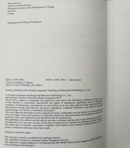 近日,外国语学院翻译系副主任孟祥春副教授英译的《生态时代与中国古典自然哲学》(The Ecological Era and Classical Chinese Naturalism)由世界著名出版社施普林格(Springer)出版集团出版并在全球发行,电子版(DOI 10.1007/978-981-10-1784-1_1)也已由Springer线上发行。