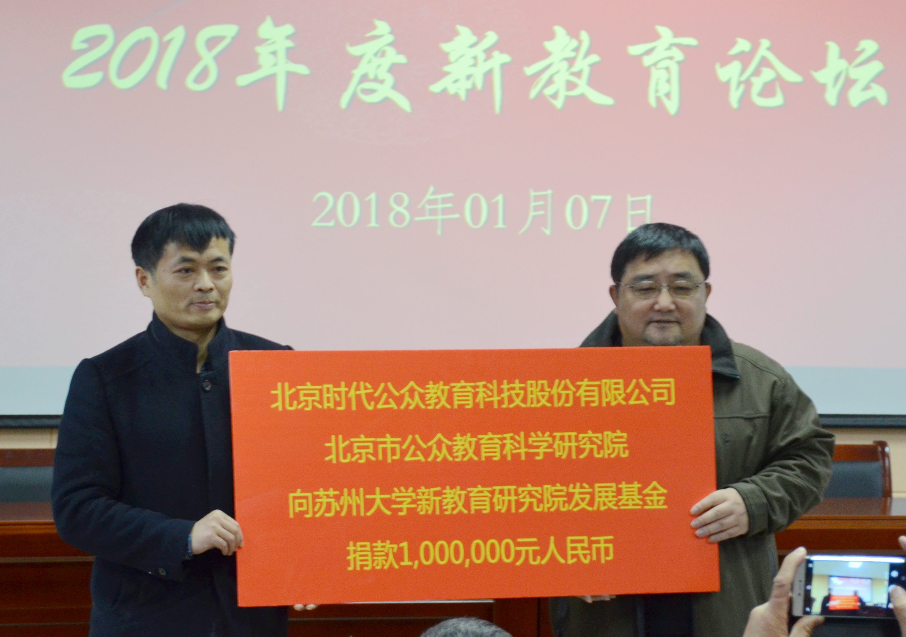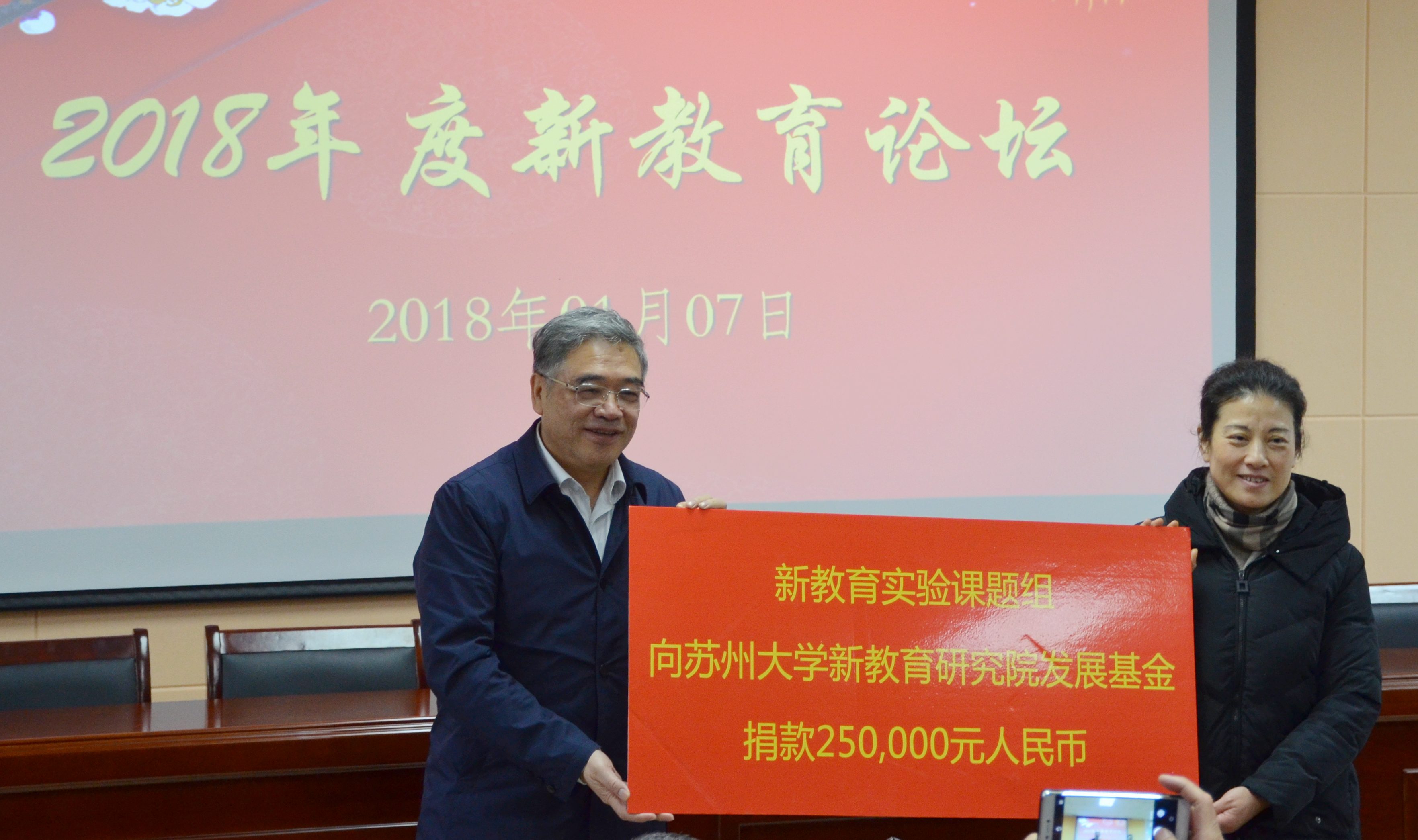 新教育理事会理事长许新海报告了新教育理事会2017年工作总结与2018年工作计划。随后,举行了捐款仪式,新教育实验课题组向苏州大学新教育研究院发展基金捐款25万元,北京时代公众教育科技股份有限公司、北京市公众教育科学研究院向苏州大学新教育研究院发展基金捐款100万元,两项捐款旨在促进苏州大学新教育研究院的发展。