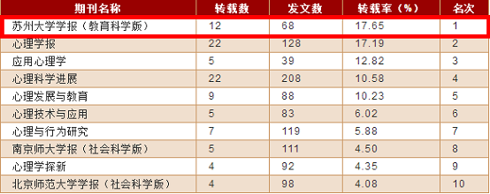 3月26日,在中国人民大学人文社科成果评价发布论坛暨学术评价与学科发展研讨会发布的《2018年度复印报刊资料转载指数排名研究报告》中,《苏州大学学报(教育科学版)》也取得非常亮眼的成绩。在1150种高等院校主办学报排名中,《苏州大学学报(教育科学版)》转载率列第3位,综合指数第6位。在教育学学科期刊转载率排名中列第1位,综合指数第6位;同时在心理学学科期刊转载率排名中列第1位,综合指数第3位。