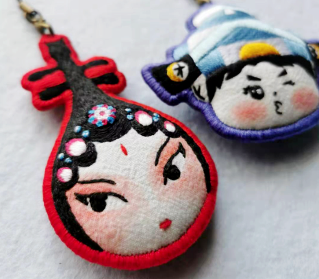 才子佳人系列香囊:才子形象以吴门四家之唐寅结合苏州博物馆造型的官帽,暗含博学多才之意;佳人形象以昆曲琵琶结合,一曲一琴,传达苏州文化美好的特征。